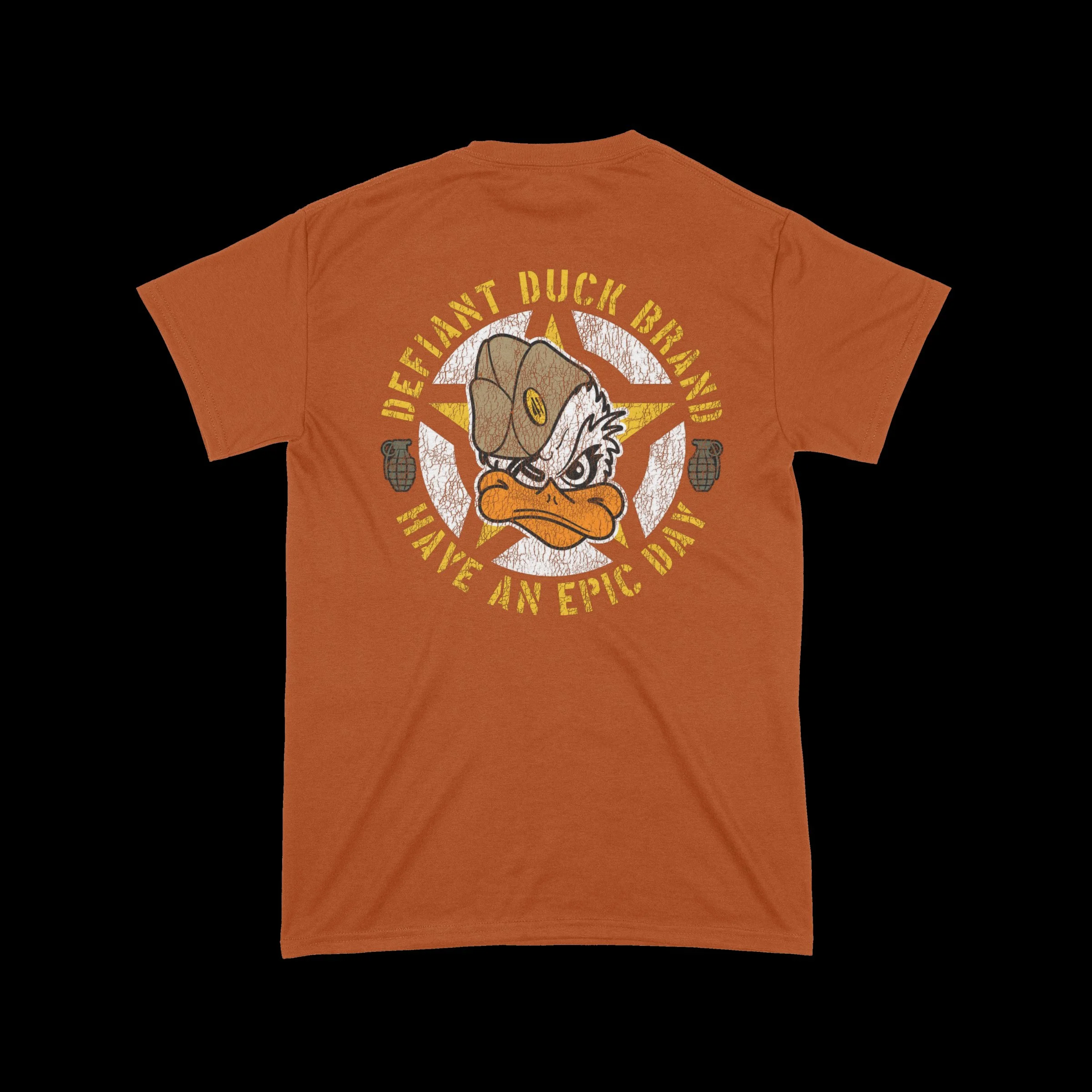 Give your dome an upgrade with this vintage wash snapback trucker hat. This lid isn’t for the meek as it features a burnt orange front/bill with a khaki mesh back emblazoned with a full color woven Defiant Duck patch . No doubt you will be bold and defiant when wearing this hat every time you put it on.